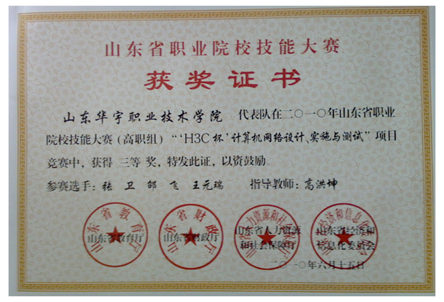 获奖证书:二O一O年山东省职业院校技能大赛(高职组)“'H3C杯'计算机网络设计、实施与测试”三等奖。