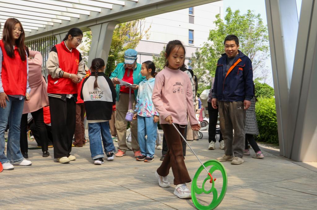 随后,进入激动人心的游戏环节,滚铁环、套圈、投壶三个经典游戏依次展开。每成功通关一个游戏,青少年们就能获得对应数量的游戏币,这些游戏币与之前获得的图书币,成为了兑换蔬菜、书籍的 “通行证”。活动现场的兑换区摆满了新鲜的蔬菜和各类书籍,青少年们拿着自己辛苦获得的“财富”,兴奋地挑选着。